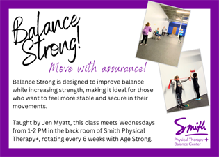 Balance Strong is a class designed for those that need to improve their balance while increasing strength. The class meets in the Balance Center of Smith Physical Therapy. The class meets every Wednesday for 6 weeks.
