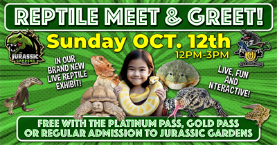Every 2nd Sunday of the month, inside of the brand new, permanent, live reptile exhibit at Jurassic Gardens, our friends from Scale World Order will be performing an interactive, educational and entertaining reptile meet and greet!