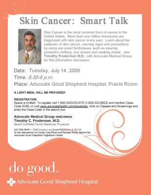 Visiting your family doctor is your first defense against skin cancer. Skin Cancer is the most common form of cancer in the United States. More than one million Americans are diagnosed with skin cancer every year. Learn about the epidemic of skin cancer, warning signs and preventions by using sun smart techniques, such as wearing protective clothing, sun screen and seeking shade. Join Timothy Froderman M.D., with Advocate Medical Group during this informative discussion.